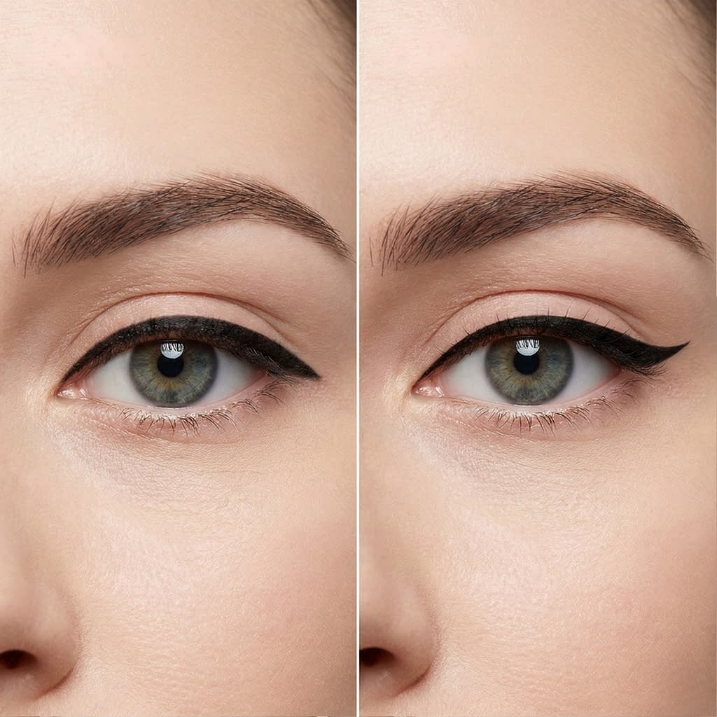A line that’s perfectly balanced on almond eyes might close off small or round eyes, or disappear on hooded lids. Matching line thickness, placement, and wing angle to bone structure and lid shape creates illusion — length, lift, or symmetry — instead of adding harshness or shrinking the eye.