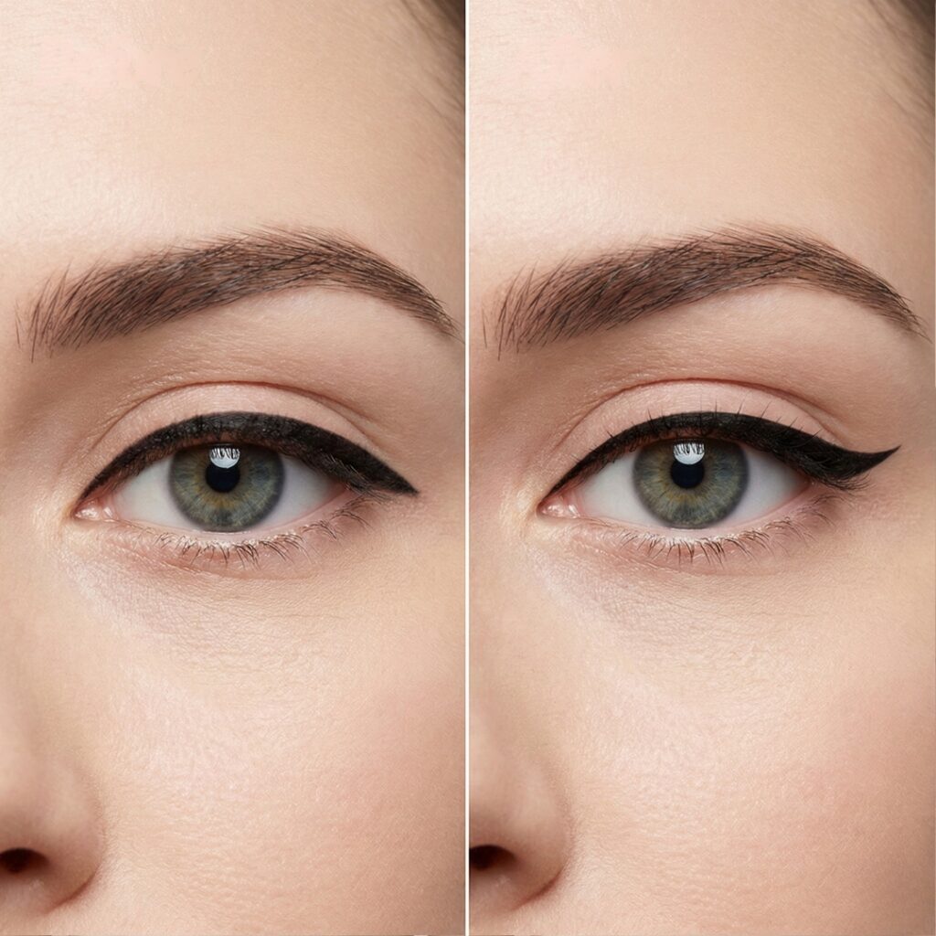 A line that’s perfectly balanced on almond eyes might close off small or round eyes, or disappear on hooded lids. Matching line thickness, placement, and wing angle to bone structure and lid shape creates illusion — length, lift, or symmetry — instead of adding harshness or shrinking the eye.