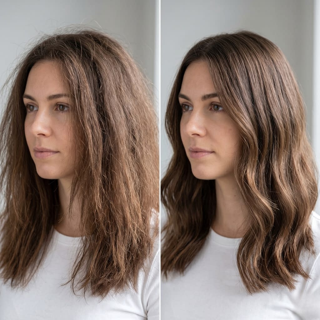 When hair loses too much moisture, it becomes less elastic and more prone to roughness. Healthy hair has enough hydration to stay flexible and smooth. Dry hair becomes stiff, brittle, and more likely to react to humidity by puffing up or frizzing.