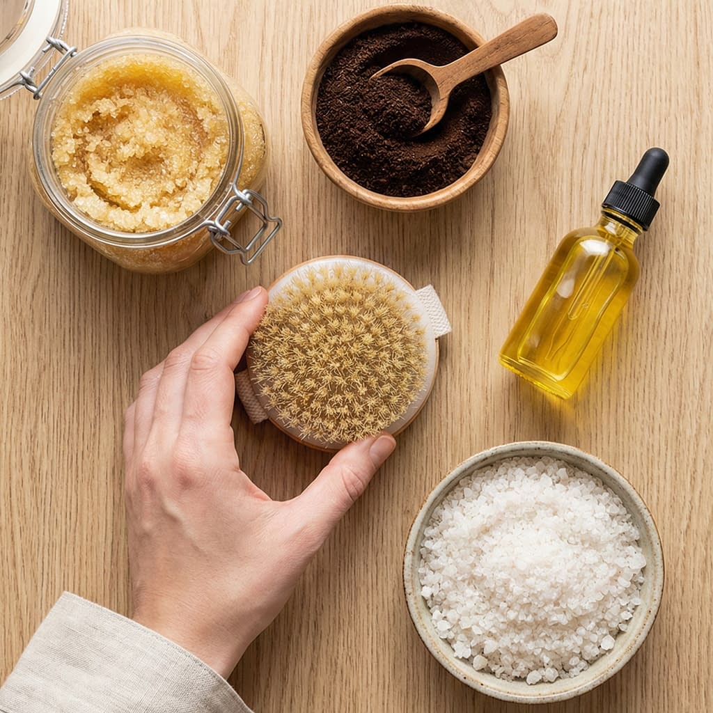 2. Use a gentle, circular motion sugar scrub or a soft body brush on damp skin for 30–60 seconds per area — don’t press hard.