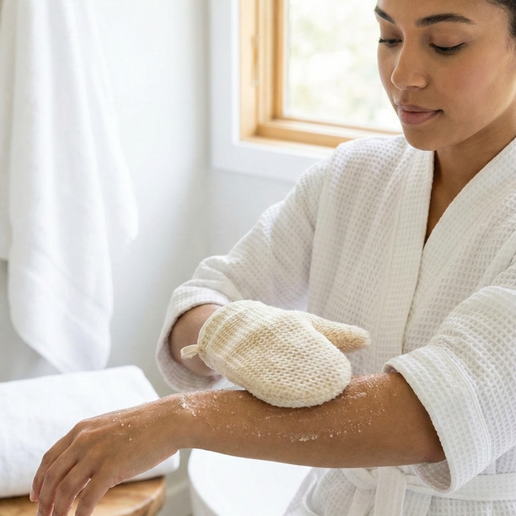 - Use a gentle, circular motion sugar scrub or a soft body brush on damp skin for 30–60 seconds per area — don’t press hard.