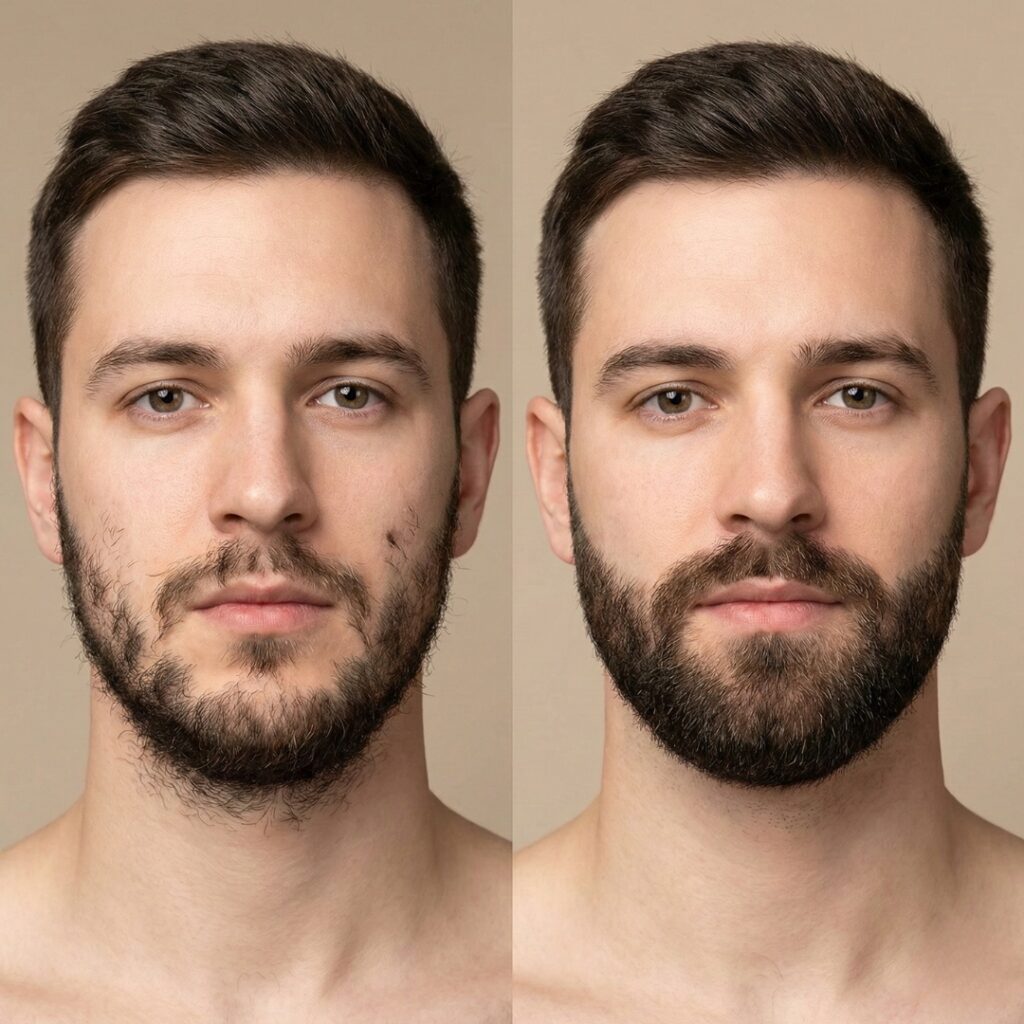 Hair doesn’t grow continuously — follicles cycle. Some follicles on your cheeks may have a short anagen phase (so hairs stay short), while those on the chin may have a longer one (long, thick hairs). That’s why the chin often looks denser. This also means you shouldn’t judge a growth attempt after only a week or two. Real changes — either natural filling-in or response to supportive measures — typically take months because of the cycles.