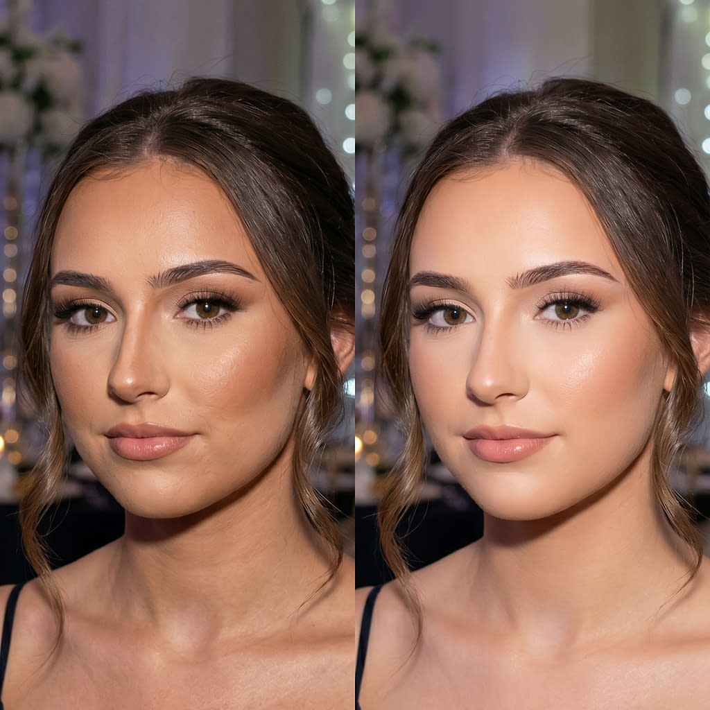 If you notice the contour looks too dark or muddy before photos start, there is still time to correct it. The easiest fix is to soften the area and bring back some brightness so the face looks more balanced again.