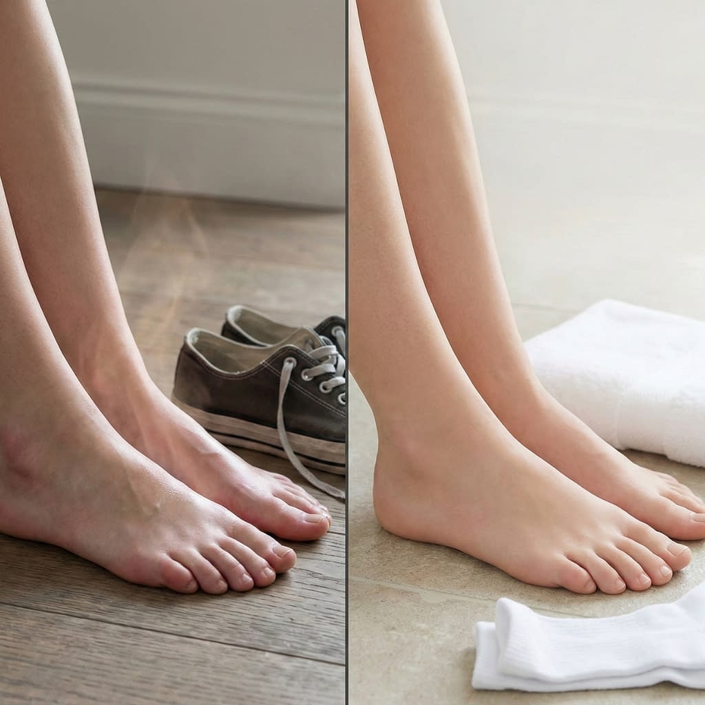 - Use antiperspirant on feet (aluminum-based roll-ons or sprays made for sweating) at night: apply to dry feet before bed — it reduces sweat production by temporarily blocking sweat ducts. Patch-test first.
