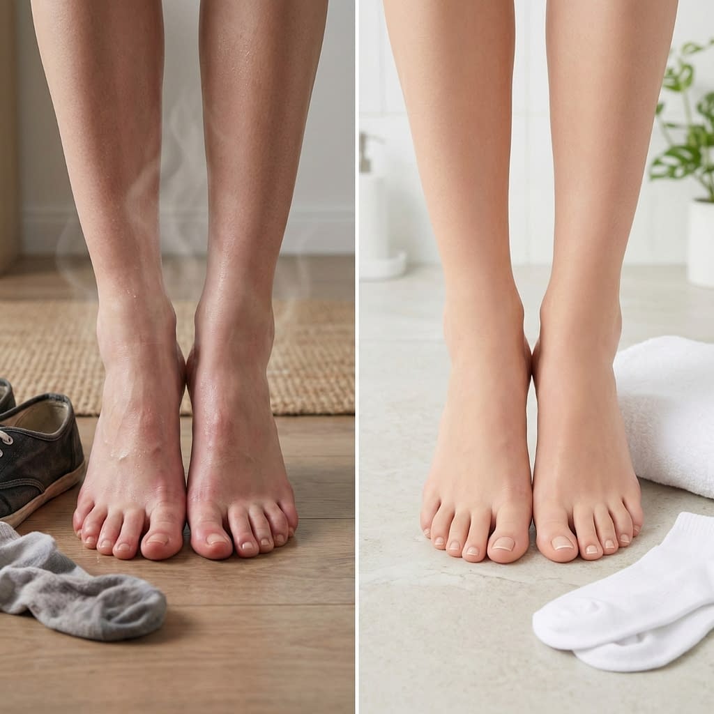- Use antiperspirant on feet (aluminum-based roll-ons or sprays made for sweating) at night: apply to dry feet before bed — it reduces sweat production by temporarily blocking sweat ducts. Patch-test first.