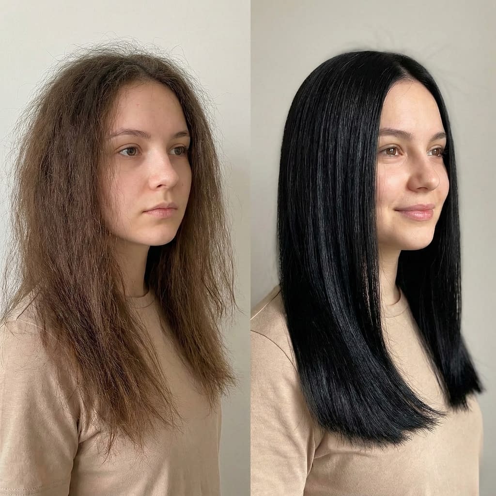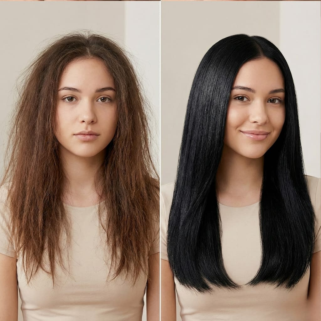 • After hair is dry, use 1–2 drops of light oil (camellia, argan) warmed on palms and smooth over lengths to flatten cuticle and add shine. Use sparingly.