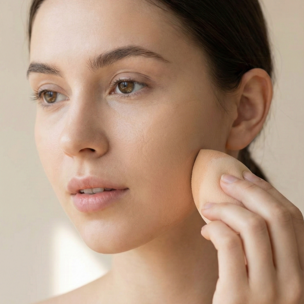 - Tint or lightweight foundation: dot and press with damp sponge (90s).