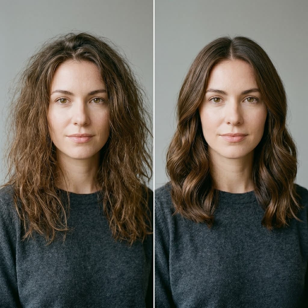 Frizz is often the first sign that humidity is winning. To keep it under control, the hair needs both moisture balance and gentle surface smoothing.