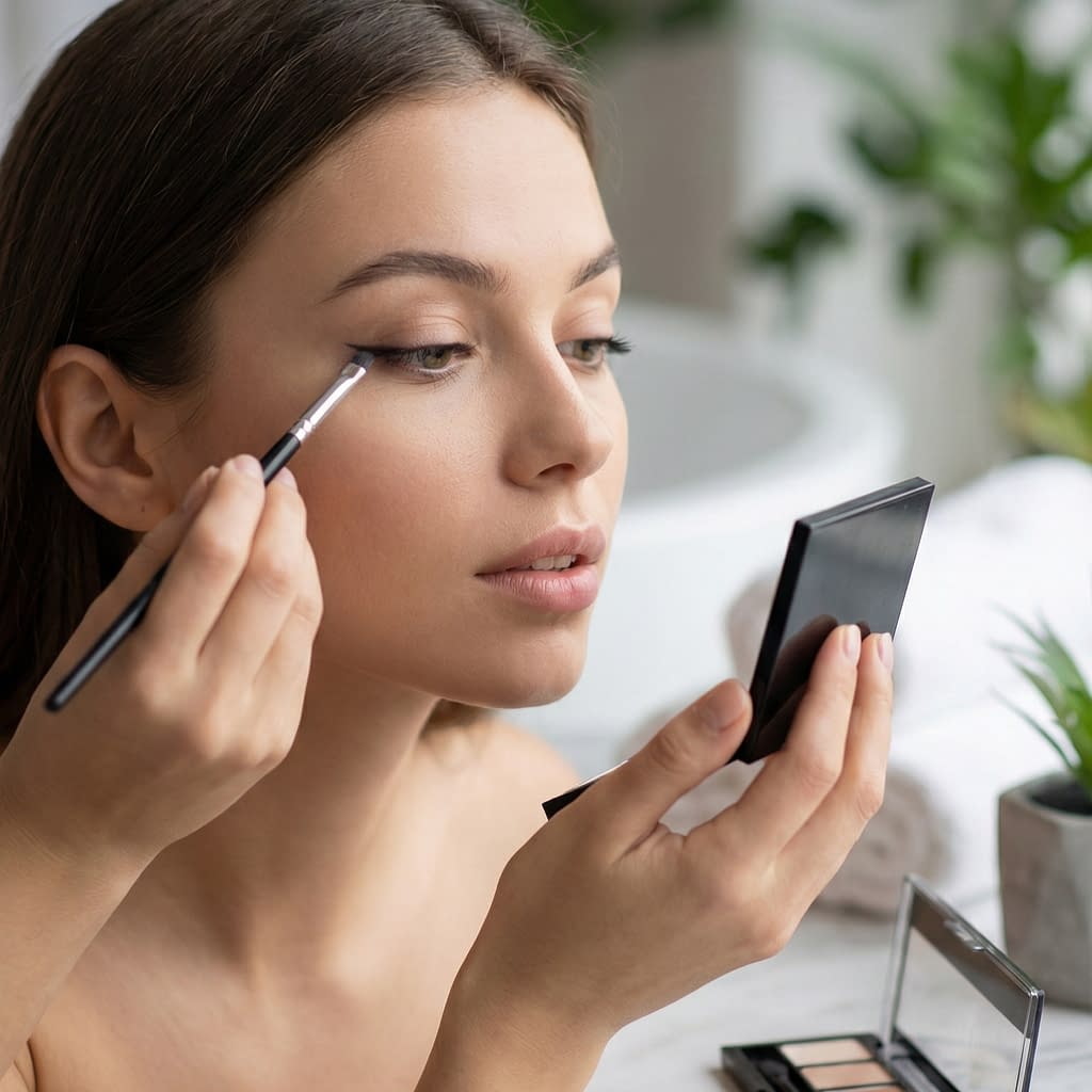 - Prime the lid: apply an eye primer or a thin layer of concealer (tap it in with your ring finger) to even tone and provide grip for shadows. For oily lids, a powder primer or a tiny dusting of translucent powder helps prevent creasing.