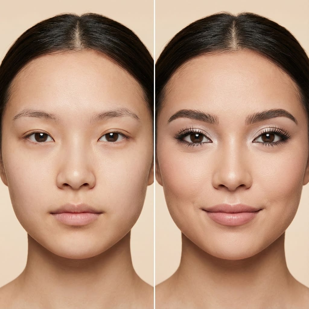 Makeup can change perceived proportions. Small eyes read smaller when surrounded by heavy dark colors, harsh liner, or flattened shadow. Makeup that brightens the inner area, lifts the outer corner, and adds vertical lift makes the eye appear larger. Key principles: