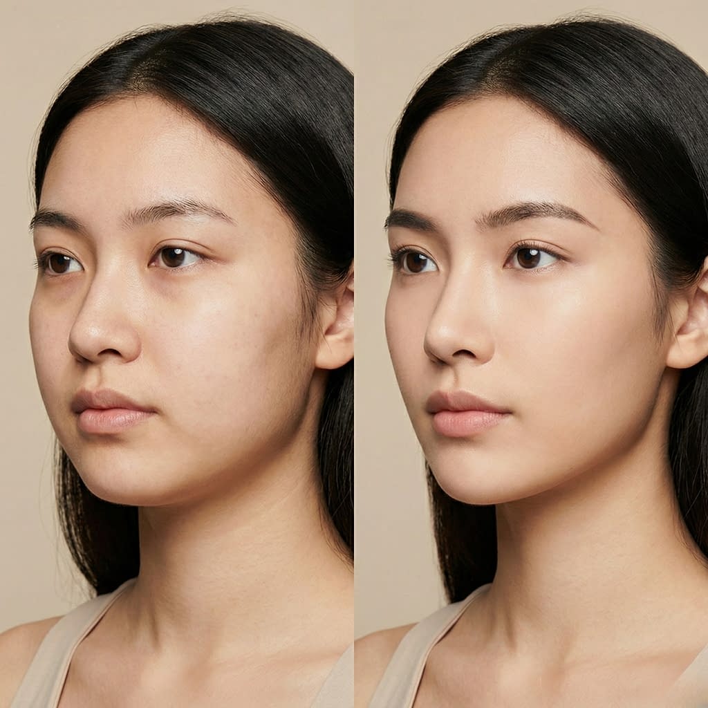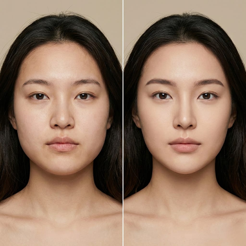 Skin-level symmetry trick: evening out tone evens perceived shape because light and shadow behave similarly across both sides.