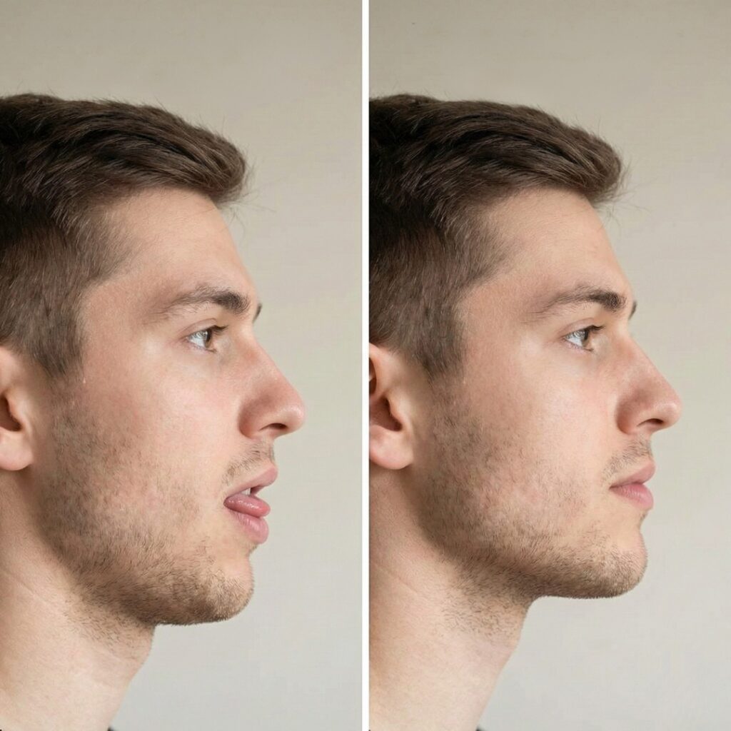 The goal is a calm, balanced posture—not forceful mandibular advancement. If jaw pain, popping, or discomfort develops, stop and consult a dentist/orthodontist.