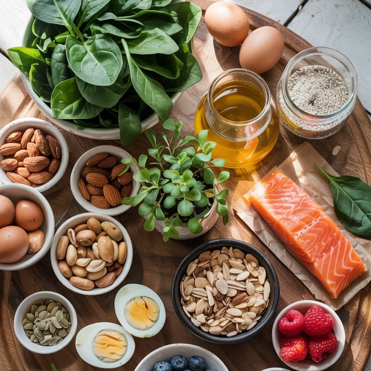 - Biotin & B-vitamins: eggs, nuts, whole grains — important for energy and hair cell turnover.