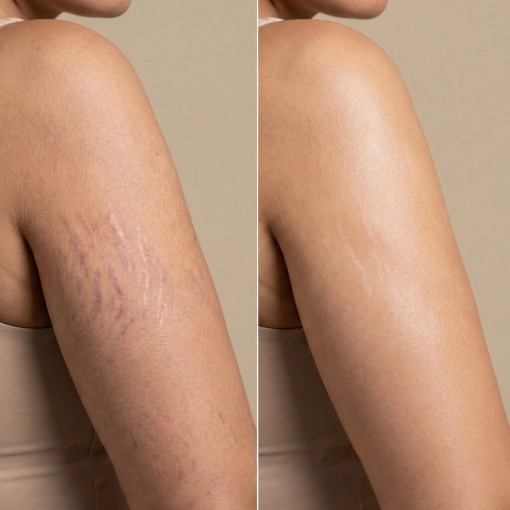 - Short term (4–12 weeks): reduced redness, softer texture, beginning of visual fading for newer marks