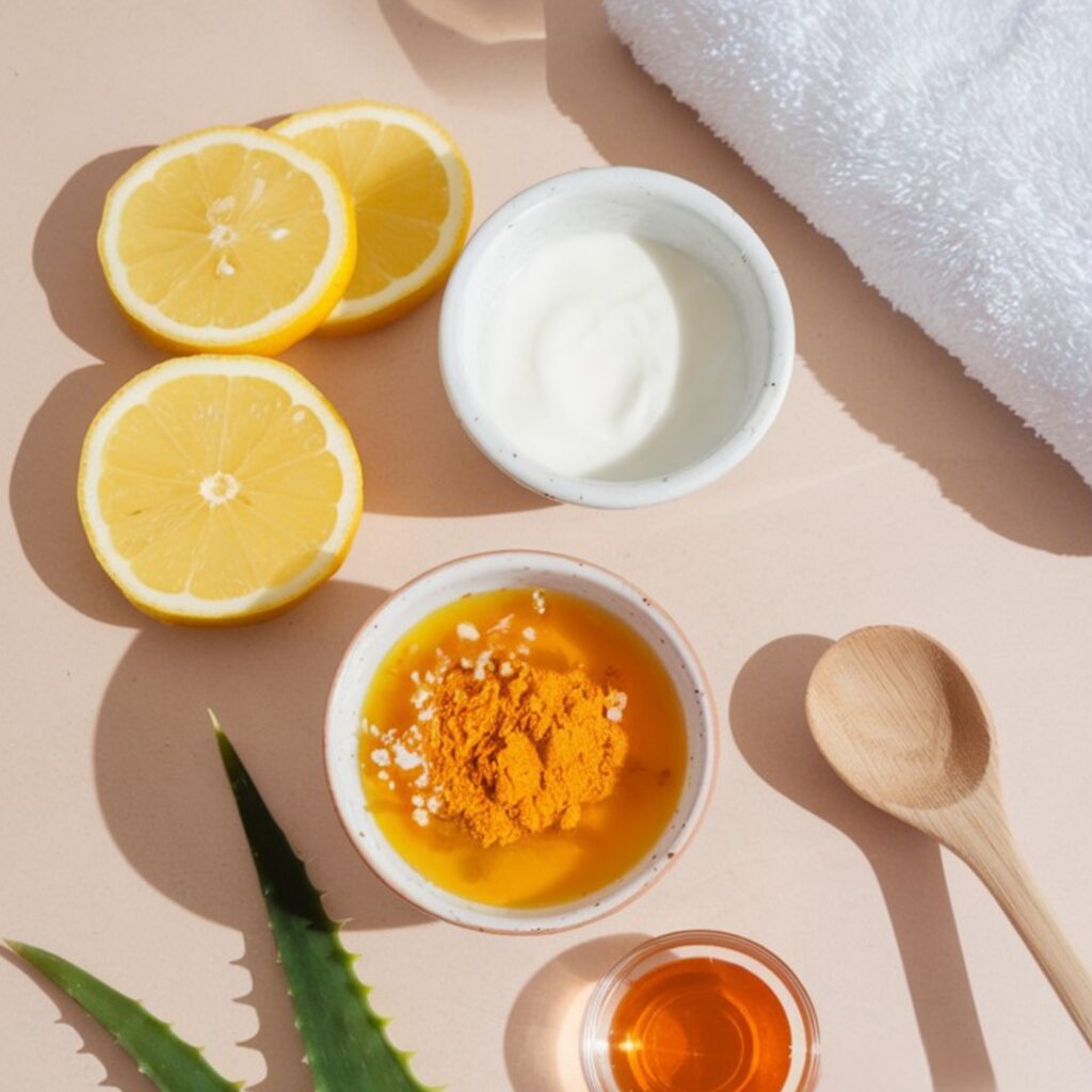 - 2 tbsp yogurt + ½ tsp turmeric + 1 tsp honey → mix, apply 10–15 min, rinse.
