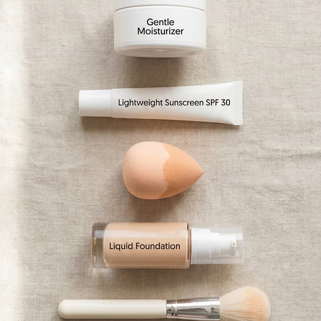 - Lightweight moisturizer — thin layer only.