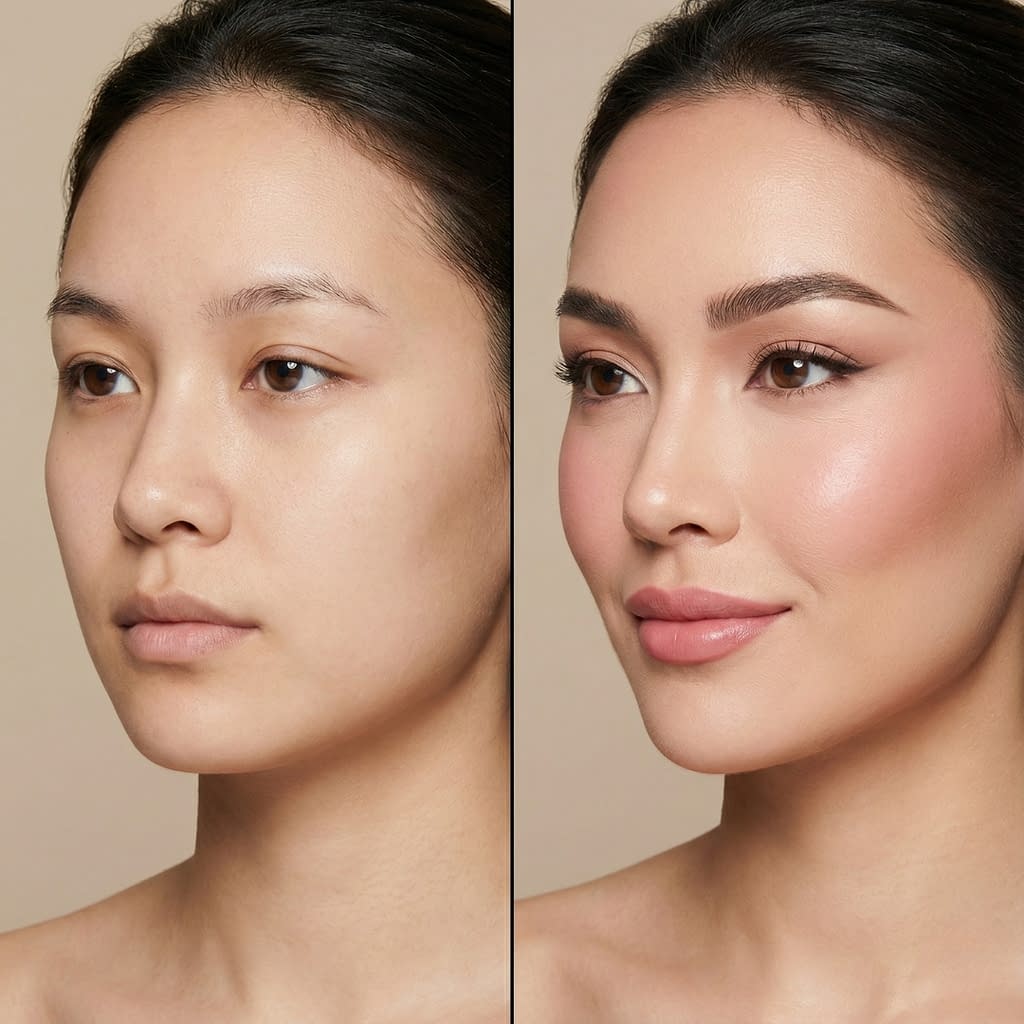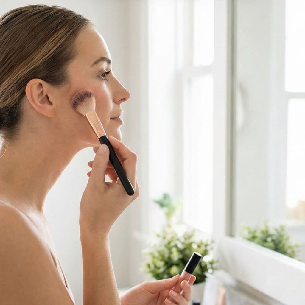 2. Placement: smile slightly and apply blush to the top of the cheek apple, then sweep upward toward the temple (not across the cheek horizontally). This upward motion reads like a lift.