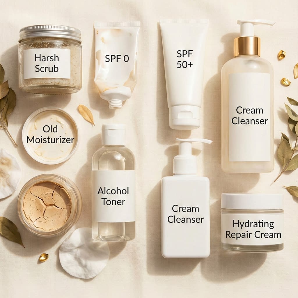- Week 1: Switch to a gentle cleanser; start daily SPF; add a moisturizing routine AM/PM.