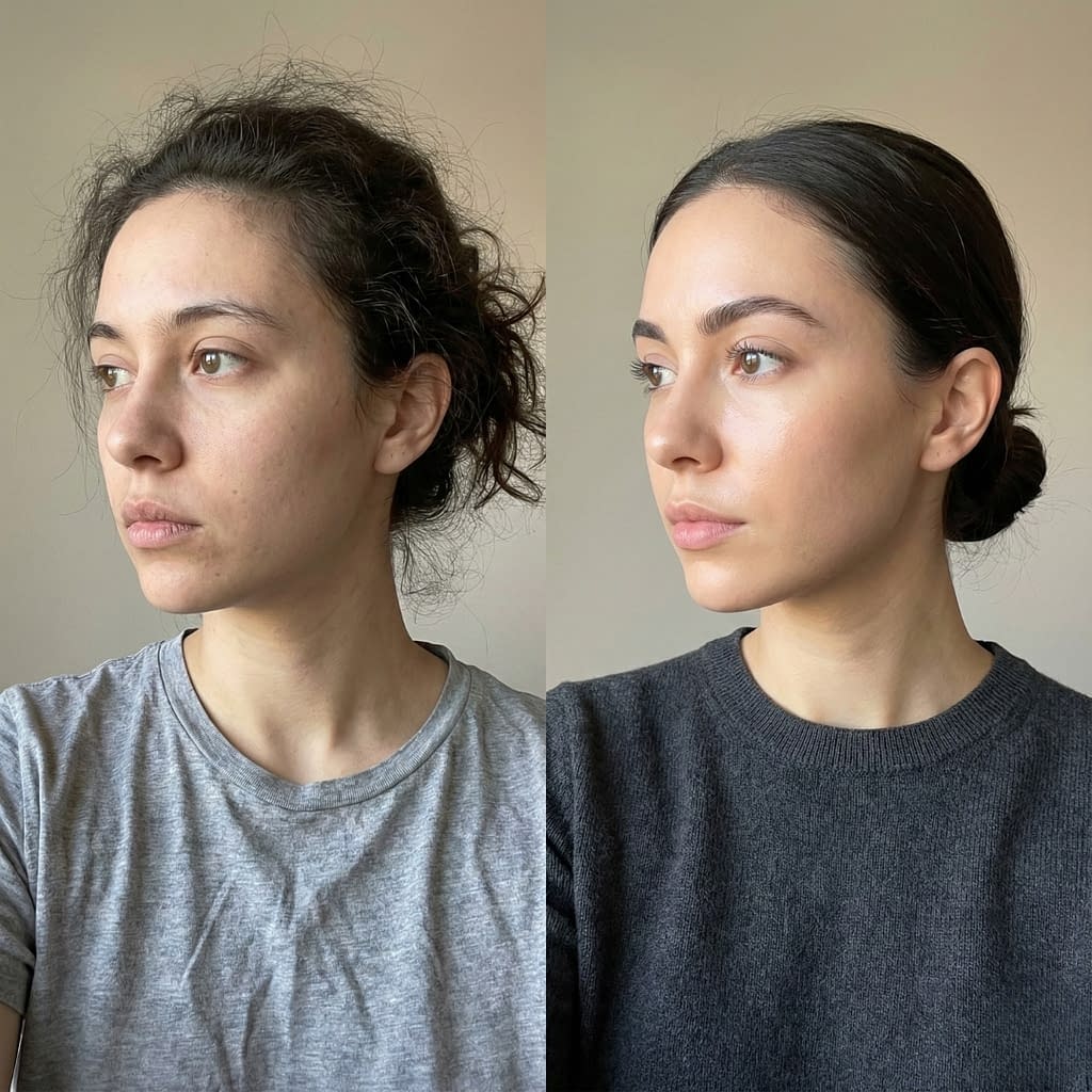- Light makeup: tint/conceal, brows, mascara, lip balm (3 min).
